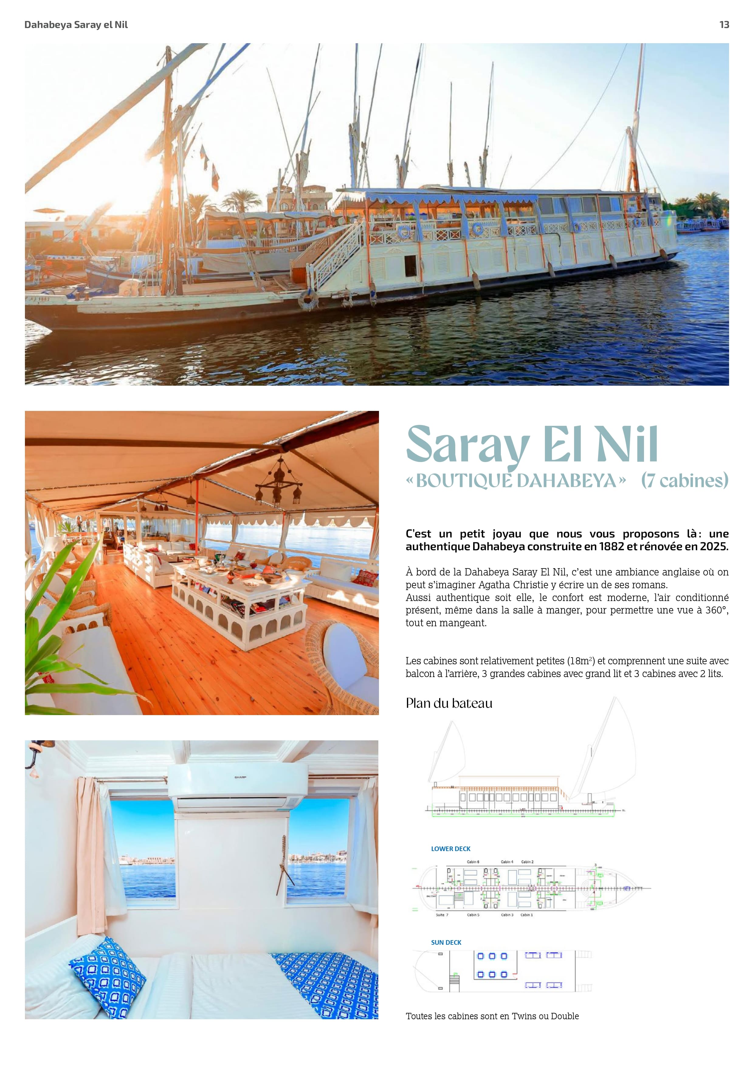 La Dahabeya Saray El Nil est un véritable joyau du fleuve, un bateau de légende construit en 1882 et entièrement rénové en 2025. Ce navire d’exception, classé parmi les plus authentiques du Nil, évoque l’élégance du temps d’Agatha Christie, lorsque les voyageurs européens découvraient l’Égypte au rythme des voiles et des histoires millénaires.
