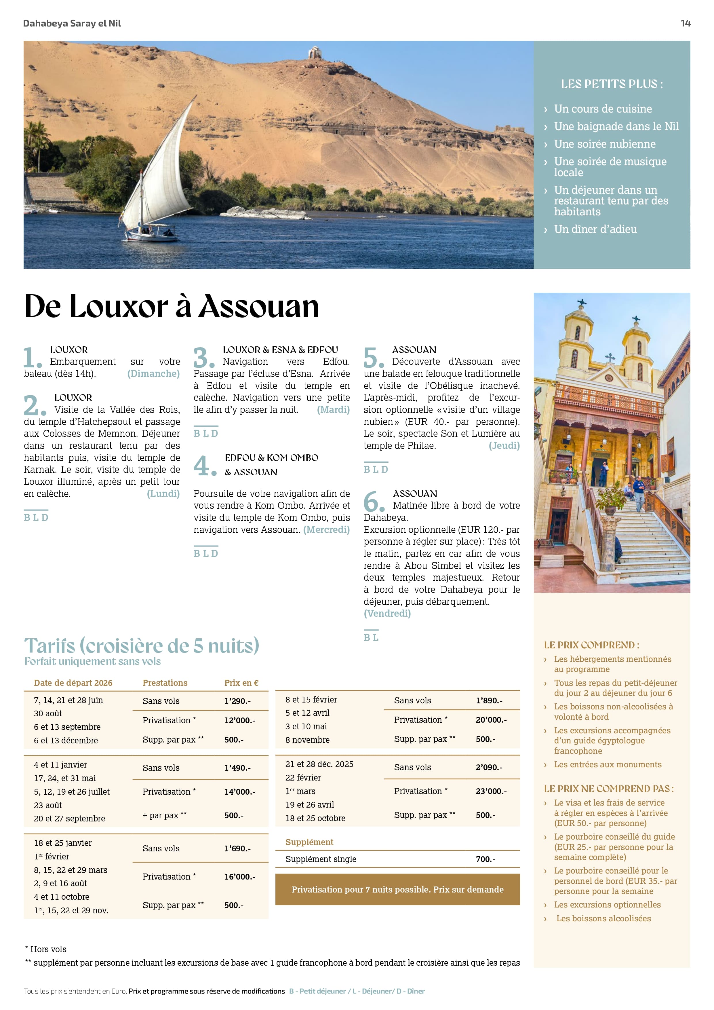 Le prix comprend : la pension complète, les boissons non alcoolisées, les excursions mentionnées avec guide francophone, entrées aux monuments et l’hébergement à bord selon la catégorie choisie.