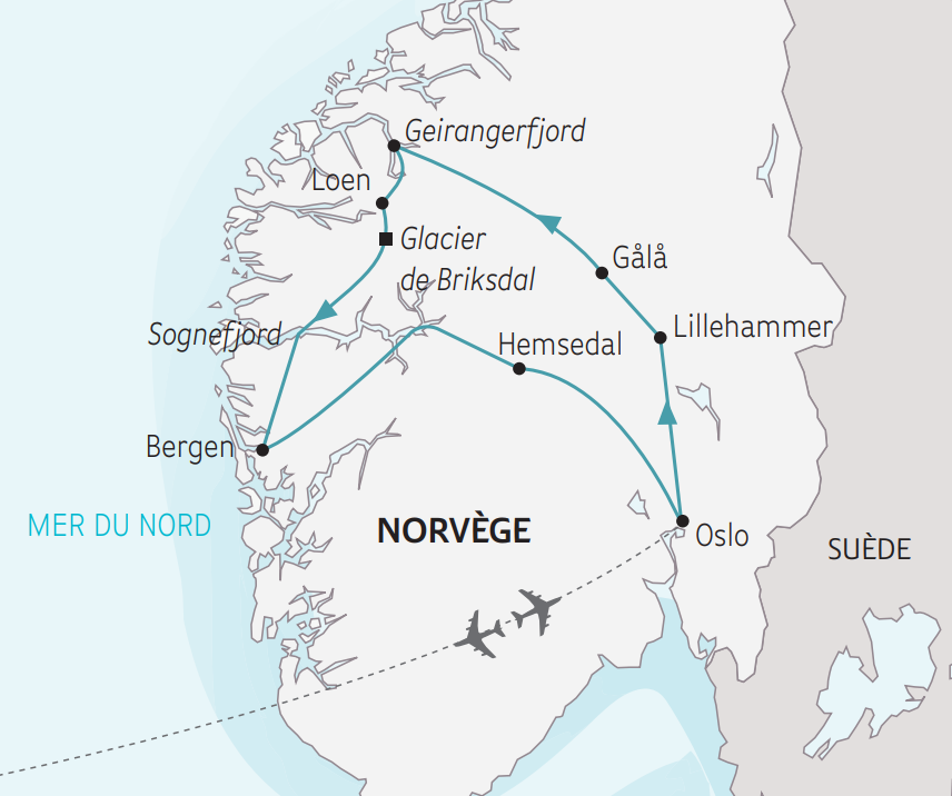 Ce programme a été conçu pour offrir une découverte équilibrée des grands incontournables norvégiens. Dès le début du séjour, le groupe rejoint Oslo avant de traverser des paysages variés en direction de Lillehammer puis Gålå. Le voyage continue ensuite vers Lom, Geiranger, Loen et Bergen, avant de rejoindre la région du Sognefjord, Hemsedal puis Oslo pour la fin du circuit.